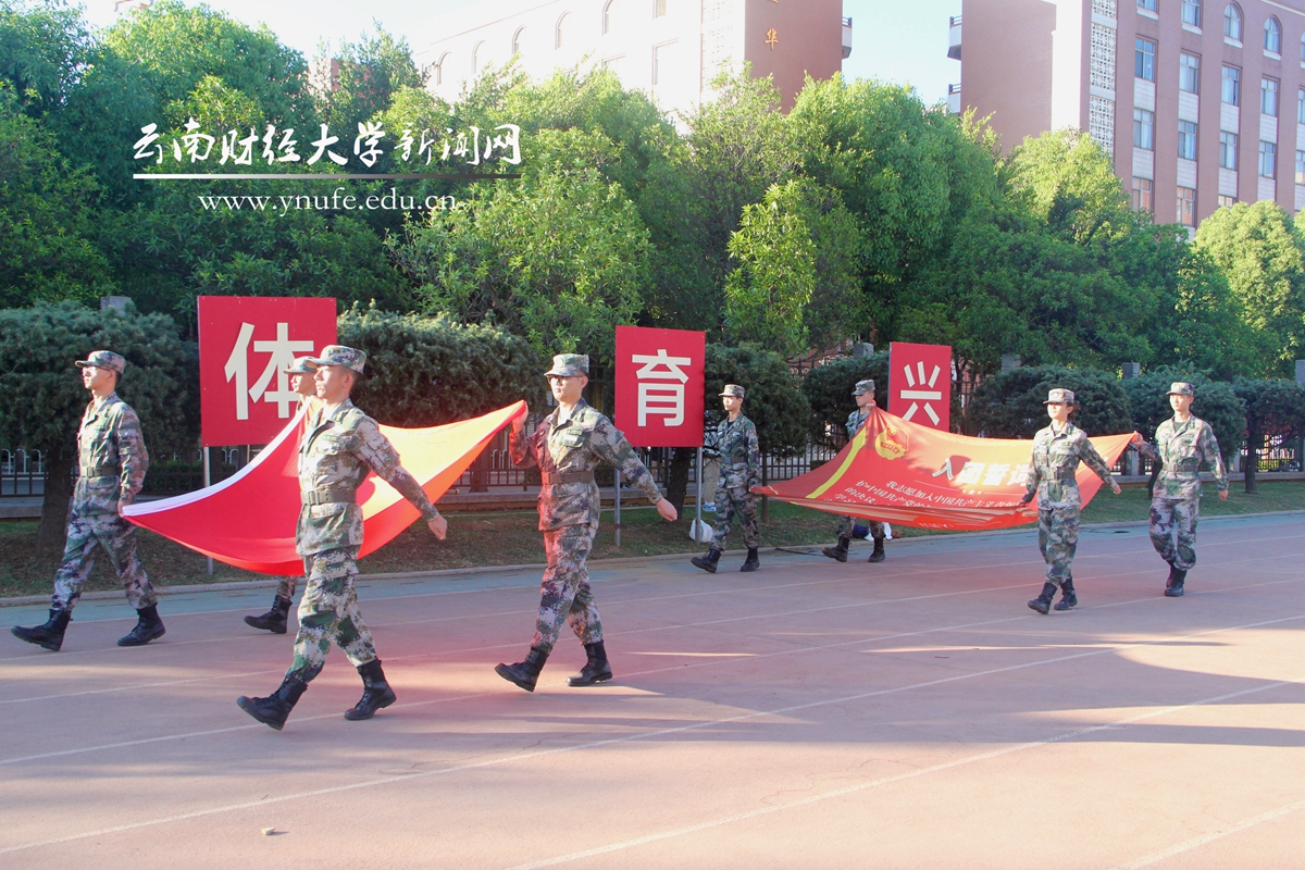 伴随着冉冉升起的朝阳,国防后备连的同学们迈着坚定有力的步伐护送国旗走向升旗台,全体师生面向国旗庄严肃立,行注目礼。雄壮激昂的《义勇军进行曲》响起,鲜艳的五星红旗徐徐升起,迎风飘扬,在晨光中熠熠生辉……