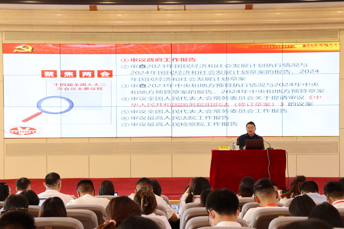 为深入学习贯彻落实全国两会精神,教育引导广大团干部提高政治站位,切实把思想和行动统一到党和国家的决策部署上来。省委党校校刊部副主任、副教授张雪鹏围绕“学习贯彻2024年全国两会精神”主题,结合云南省经济发展实际,用清晰的逻辑、鲜活的数据和精辟的语言,对全国两会精神进行了全方位、多角度的解读。理论授课具有很强的理论性、针对性、思想性和指导性,为广大团干部进一步做好共青团工作提供了思想遵循和工作指引。