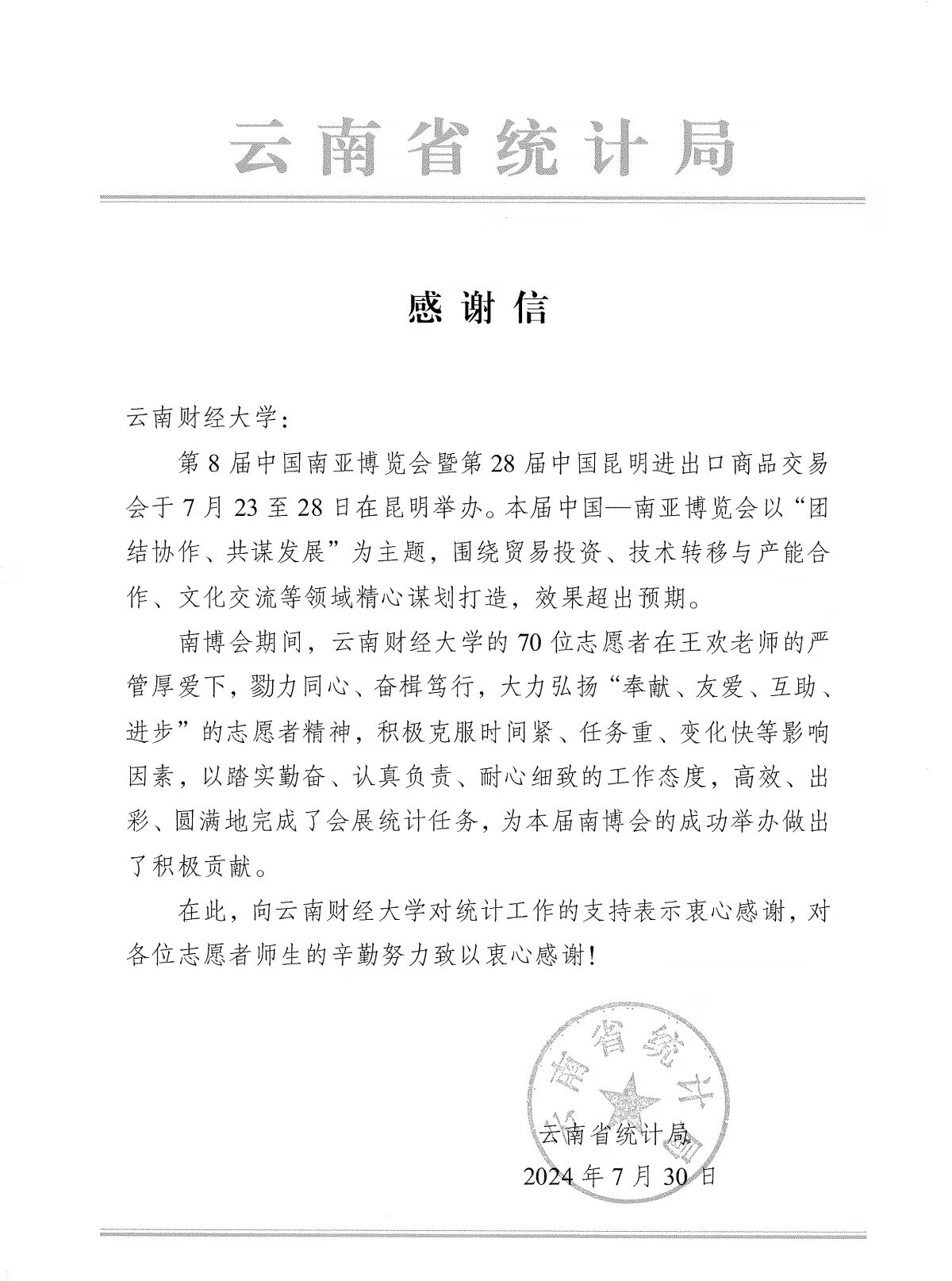 近日,省统计局向beat365发来感谢信,向beat365对第8届中国—南亚博览会暨第28届中国昆明进出口商品交易会的支持表示感谢,对beat365志愿者给予高度赞扬。