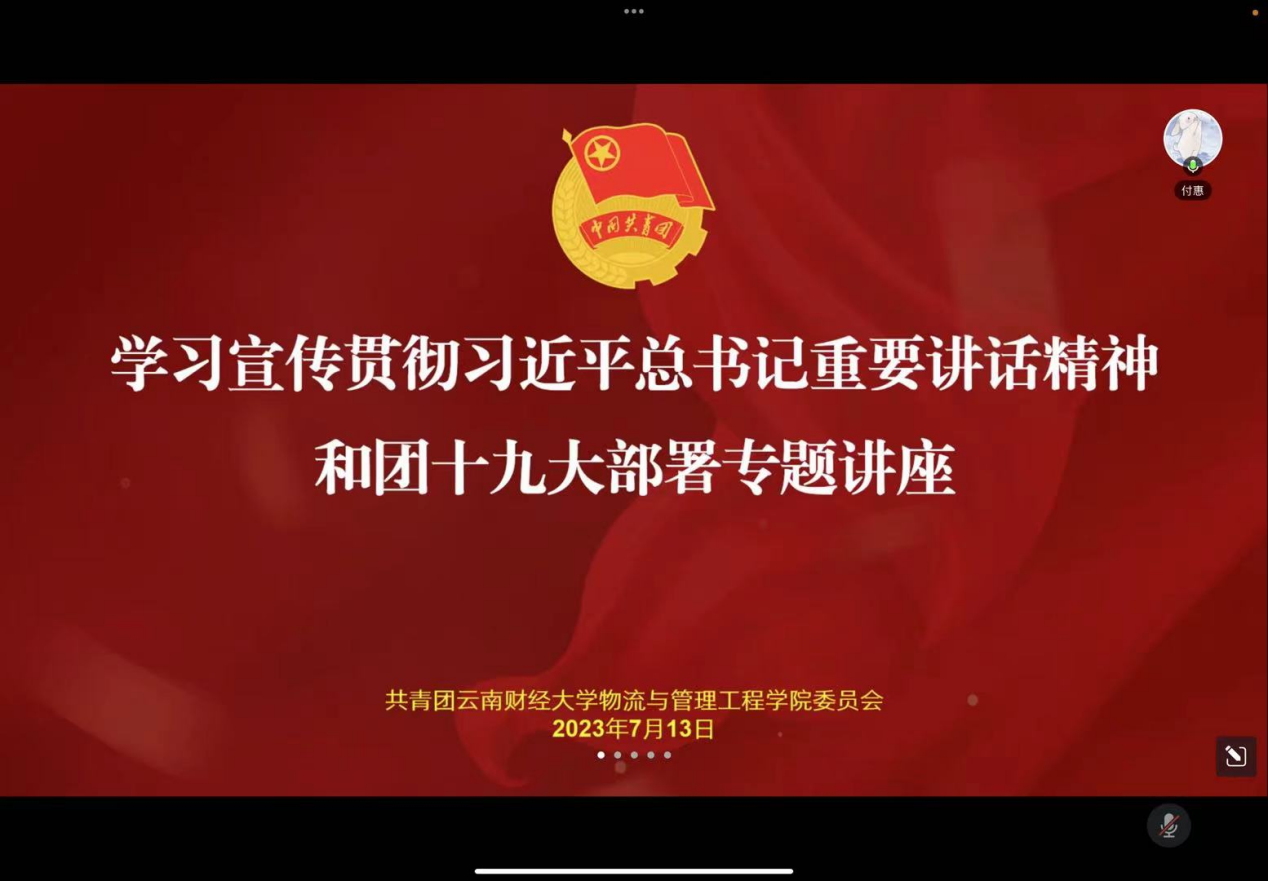 为深入学习宣传贯彻习近平总书记在同团中央新一届领导班子成员集体谈话时的重要讲话精神,全面落实团十九大部署,beat365英国官方网站物流与管理工程学院于2023年7月13日通过线上会议开展深入学习贯彻习近平总书记重要讲话精神和团十九大部署专题讲座。本次专题讲座由团委负责人付惠老师主讲,物流与管理工程学院全体团学骨干积极参与。