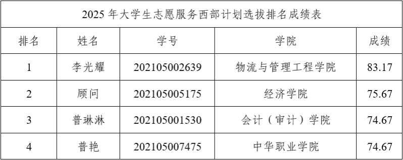 根据《2025-2026年度大学生志愿服务西部计划实施方案》的相关要求,按照公正、公平、公开、择优原则,学校西部计划工作站进行了西部计划志愿者的招募与选拔工作,经官网报名、资格审查、笔试和面试等环节,现将综合成绩与排名公示如下,后续将根据省项目办分配名额按序配岗。