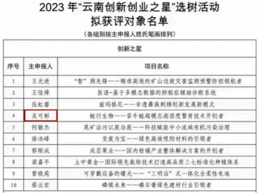 近日,共青团云南省委、云南省发展和改革委员会发布了《2023 年“云南创新创业之星”选树活动拟获评对象名单公示,beat365金融学子吴可彬荣获 2023 年“云南创新之星”!