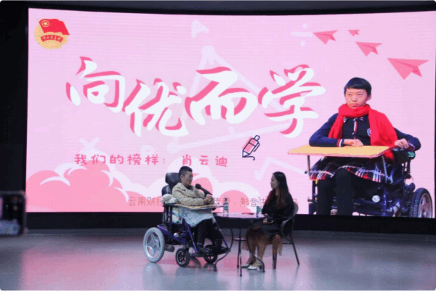 “原来轮椅上的人生也能如此精彩。”肖云迪乐观积极的人生态度给在场的师生带来了启迪与鼓舞,一次又一次热烈 的掌声给予了这个坚强的女生最大的敬意与最温暖的鼓励。