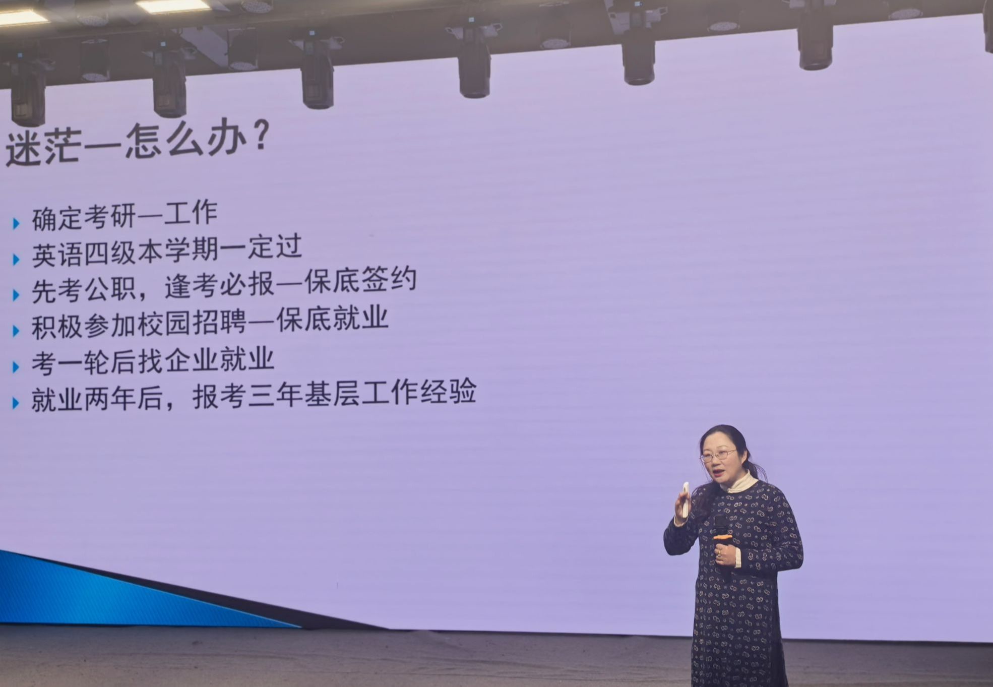 王彬以“时代召唤,人生责任”作为开篇,强调了新时代赋予青年一代的使命和责任,鼓励同学们立大志、明大德、成大才、担大任,把小我融入大我,与时代同频共振,以自身专业技能和兴趣爱好为基础做出自己的职业选择。她结合历年公职类岗位的发布情况,聚焦公职类考试考情,分析了当前就业形势,分享了实用的备考策略和答题技巧,引导同学们树立正确的就业观,提前做好职业生涯规划,坚定信心,以积极的心态迎接考试。王彬表示,希望同学们充分利用在校时间提升自身综合素质,为每一个高质量就业机会做好充分的准备。