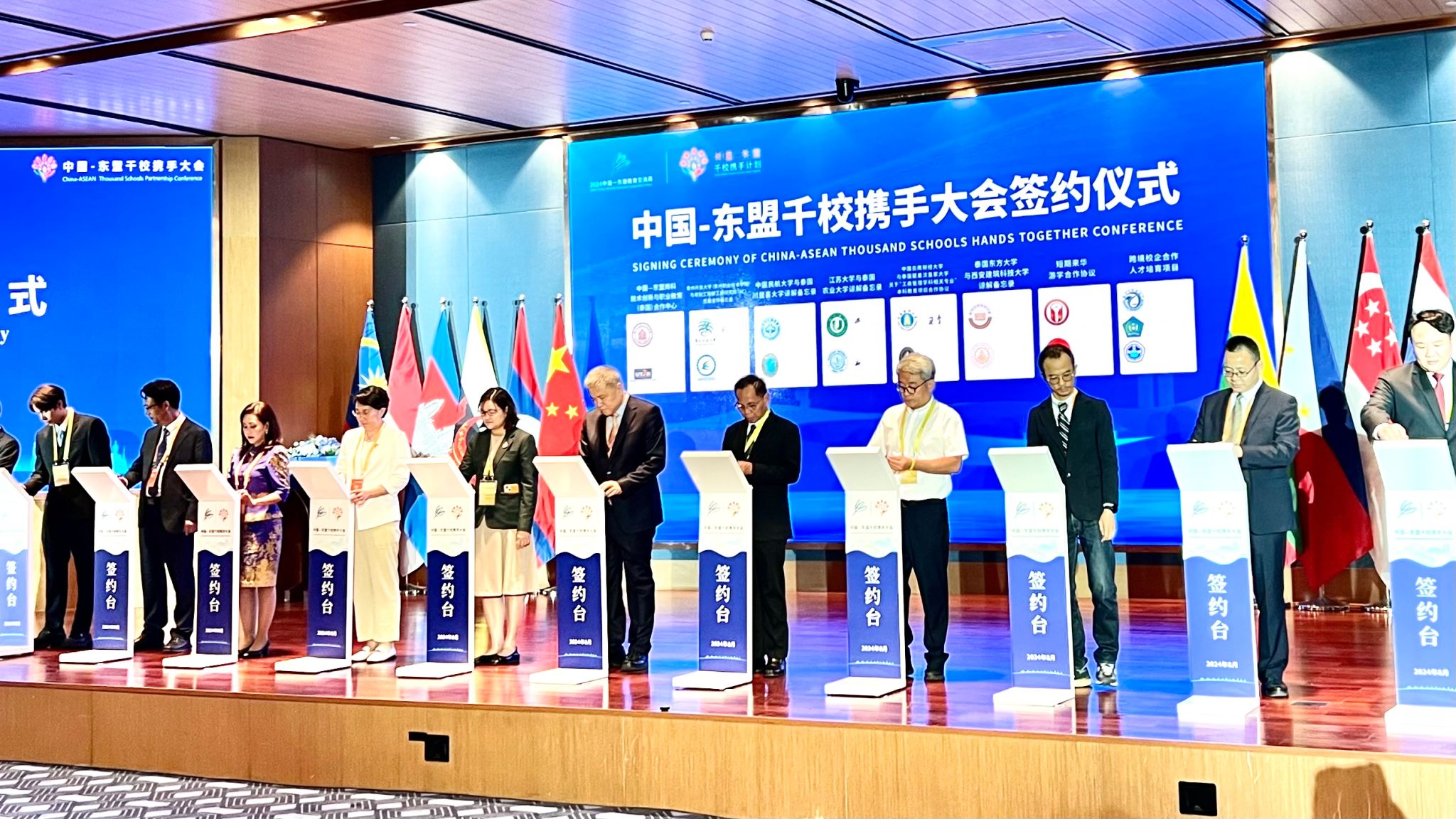 在“中国-东盟千校携手大会”活动现场,beat365英国官方网站作为14所代表院校之一,与合作方泰国碧差汶皇家大学共同上台参加签约仪式。