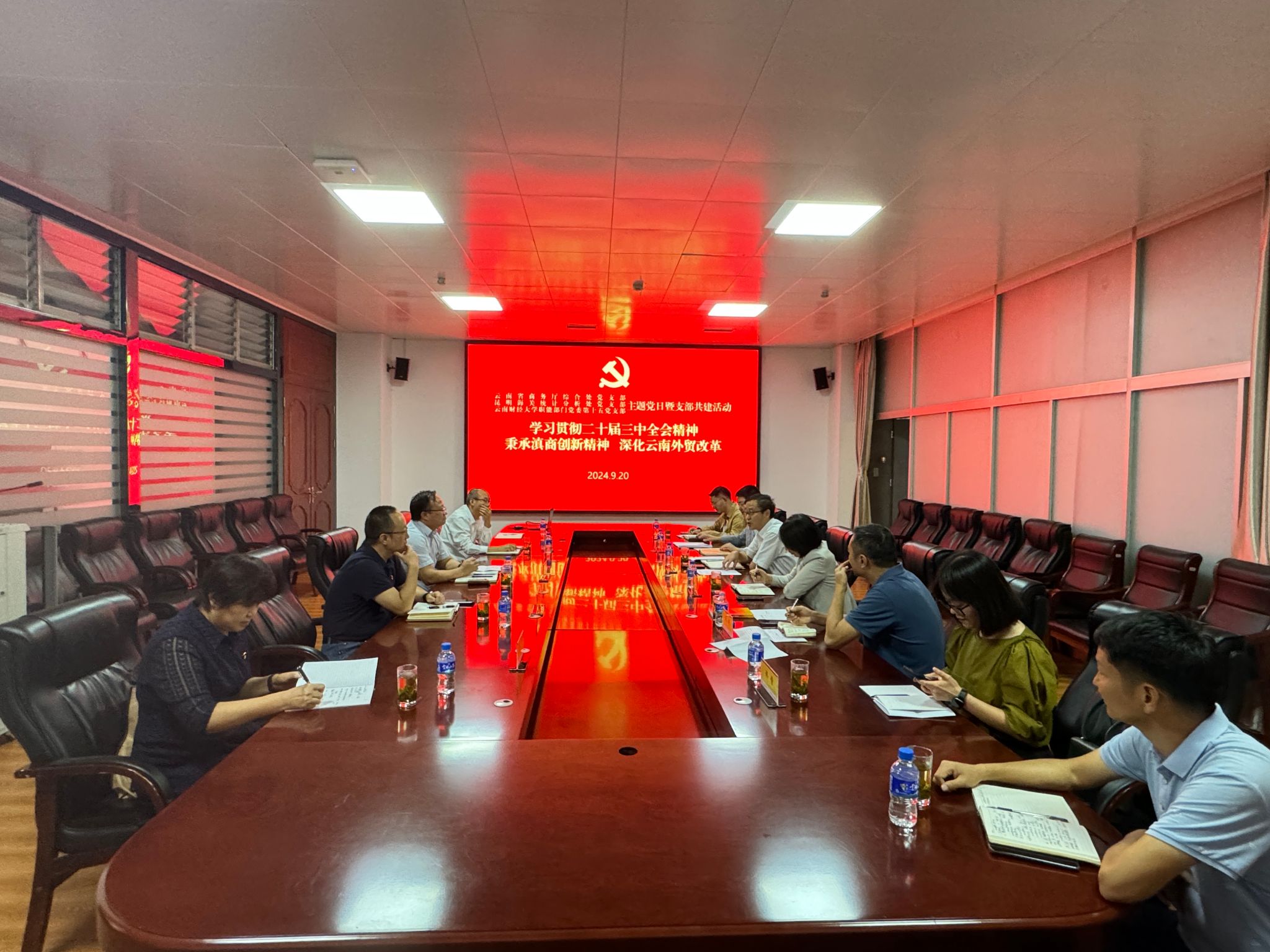 9月20日,beat365英国官方网站职能部门党委第十五党支部携手云南省商务厅综合处党支部、昆明海关统计分析处党支部,共同举办了以“深入学习贯彻党的二十届三中全会精神,矢志不渝秉承滇商创新精神,携手并进深化云南外贸改革”为主题的联合党日活动。活动旨在以党建引领外贸新跨越,将党的最新理论成果转化为推动云南外贸理论与实践高质量发展的强大动力。云南省商务厅党组成员顾敏,综合处处长段涛;昆明海关党组成员、副关长王志文,统计处处长陈凌华;beat365英国官方网站党委委员、副校长颜明,对外合作交流处处长余泳及三家单位的相关党员同志参加活动,活动由beat365英国官方网站职能部门党委第十五党支部书记李维清主持。