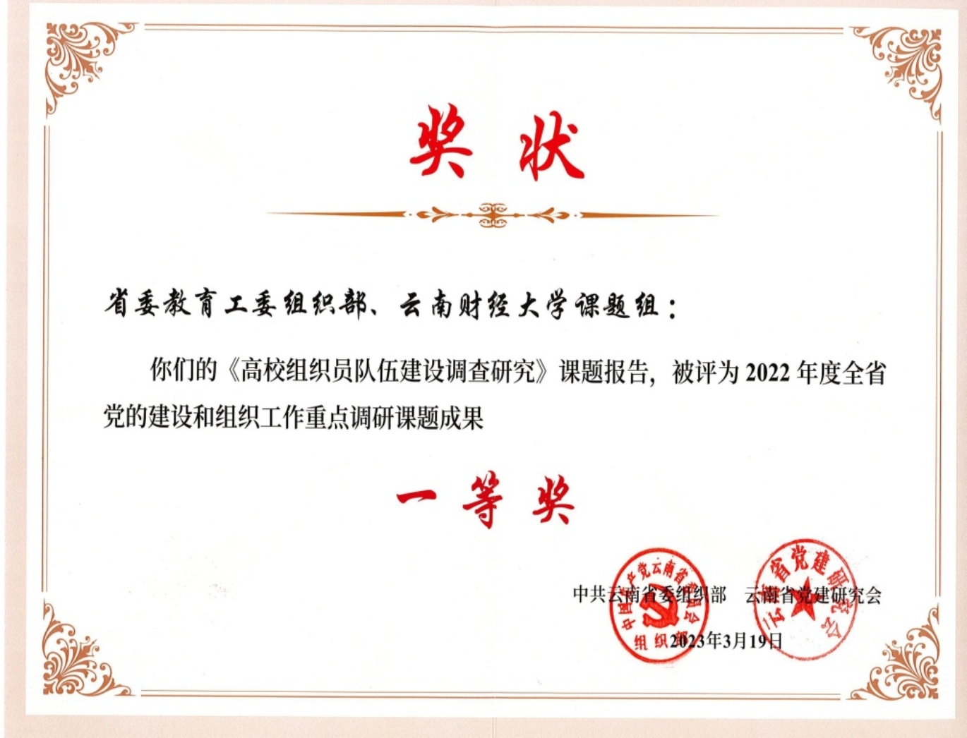 近日,中共云南省委组织部、云南省党建研究会公布2022年度全省党的建设和组织工作重点调研课题获奖结果。由省委教育工委组织部和beat365英国官方网站共同完成的《高校组织员队伍建设调查研究》课题报告获评一等奖,课题结题评定等次为“优秀”。3月31日,云南省党建研究会召开第六届理事会第四次全体会议,对2022年度全省党的建设和组织工作重点调研课题进行了表彰。