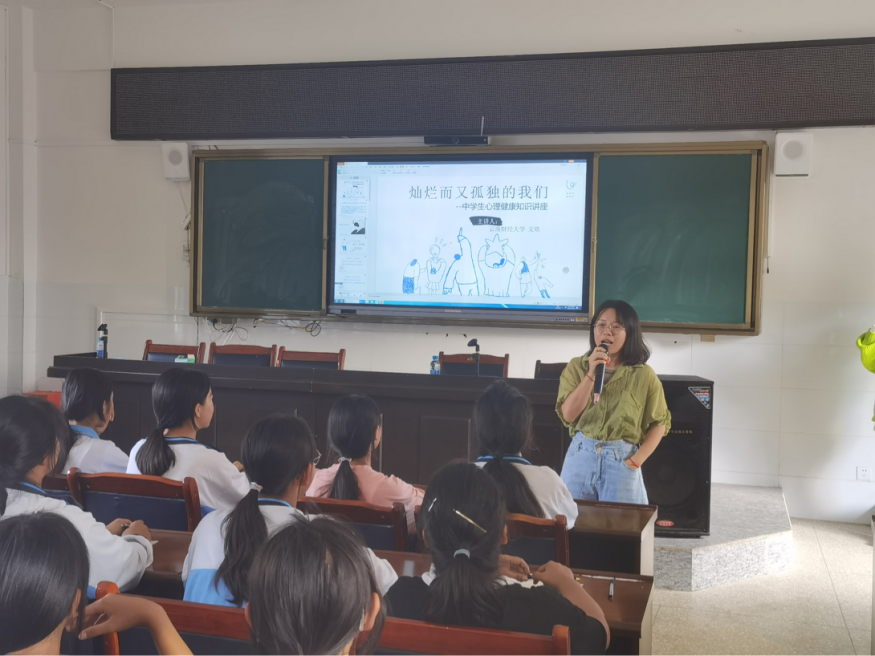 文欢以“灿烂而又孤独的我们”为主题,结合中学生心理与青春期的关系与同学们进行交流,重点从青春期的定义和特点、女生青春期的烦恼与困惑、如何正确认识心理健康等方面为同学们解疑答惑。简洁的语言、生动的图片、趣味的视频让课堂轻松有趣,同学们踊跃发言,积极讨论,对心理健康有了更加深刻的认识。